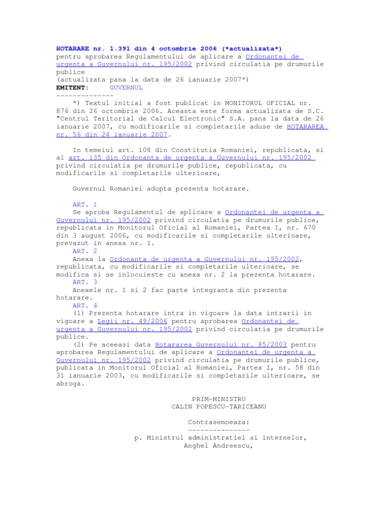 Hg Nr 1391 Din 2006 Regulament Circulatie Rutiera Projurista Ro