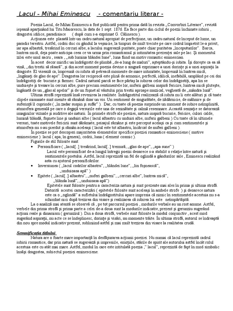 Lacul De Mihai Eminescu Comentariu Literar Docx