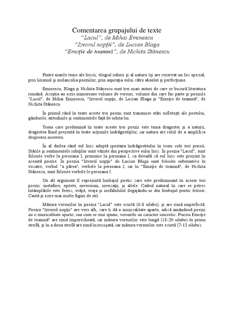 Comentariu Literar Al Poeziei Lacul De Mihai Eminescu