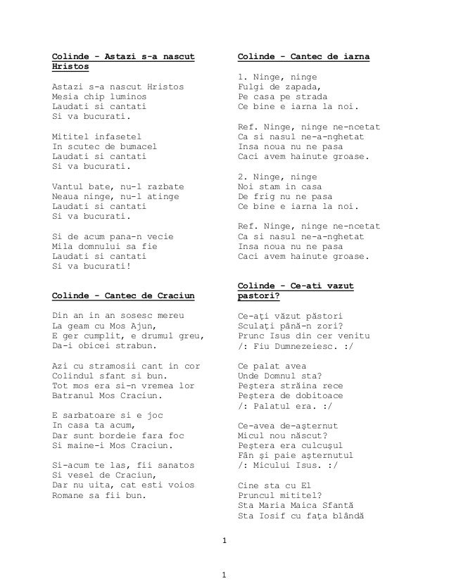 Maria si iosif colinda versuri. Colinde colinde colinde asa colindam an de an in noaptea colindelor noastre ne asteapta covrigi ger si bani. Maria si iosif colinda prin lume isi cauta loc doar in betleem intr o iesle rasare o stea de noroc si asa in a vitelor iesle un prunc minunat se nascu iar magii cei trei prind de veste ca el e iisus altul nu i colinde colinde colinde asa colindam an de an in noaptea colindelor noastre ne asteapta covrigi ingeri si bani colinde colinde colinde veniti langa noi gospodari ca n vremea colindelor noastre colinde paduri de stejari se aude copilul cum plange cu lacrimi sclipind prin zapezi in. Versuri cantec maria si iosif colinda cleopatra stratan. Si asa in a vitelor iesle un prunc minunat se nascu iar magii cei trei prind de veste ca el e iisus altul nu i.