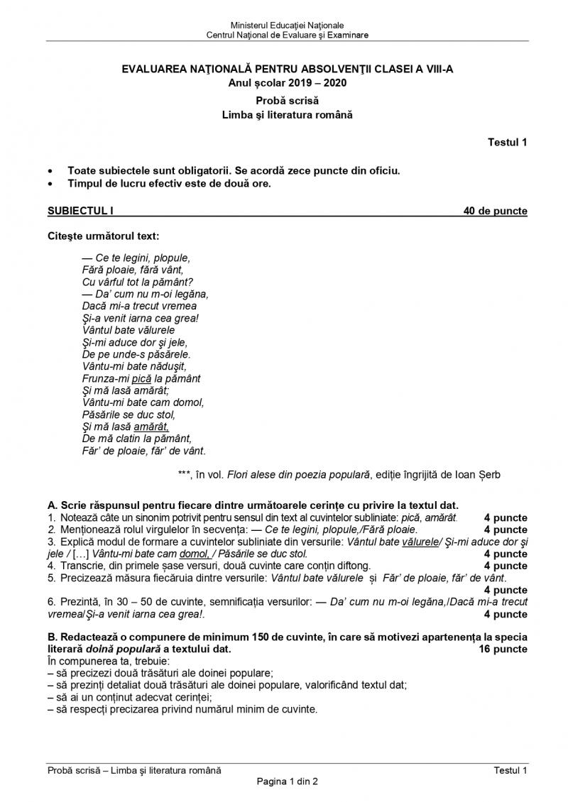 Evaluarea Naţională 2020 Subiecte Si Barem Pentru Limba Si Literatura Romană Varianta 1